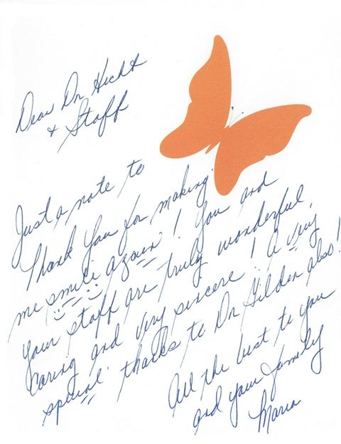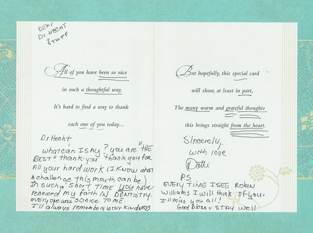 What can I say? you are “THE BEST”!! Thank – You. Thank you for all your hard work ( know what a challenge this mouth can be.) In such a short time YOU have renewed my faith in dentistry. Everyone was so nice to me. I’ll Always remember your kindness. Sincerely with love, Patti”