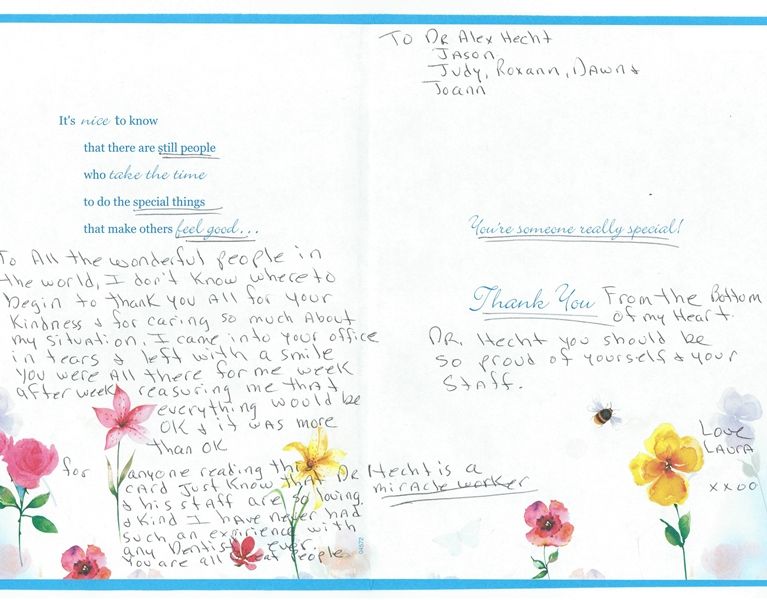 For anyone reading this card, just know that Dr. Hecht is a miracle worker and is staff are so loving and kind. I have never had such and experience with and dentist ever. You are all great people